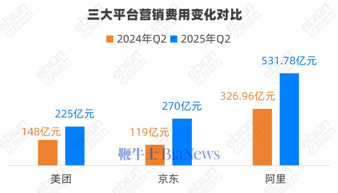 作为被迫应战的一方,美团二季度的销售及营销开支反而更少,仅增加77亿元,总额达到225亿元,同比增长51.8%。不过,美团营销开支占收入的比例,从18.0%提升至24.5%,为三大平台最高。